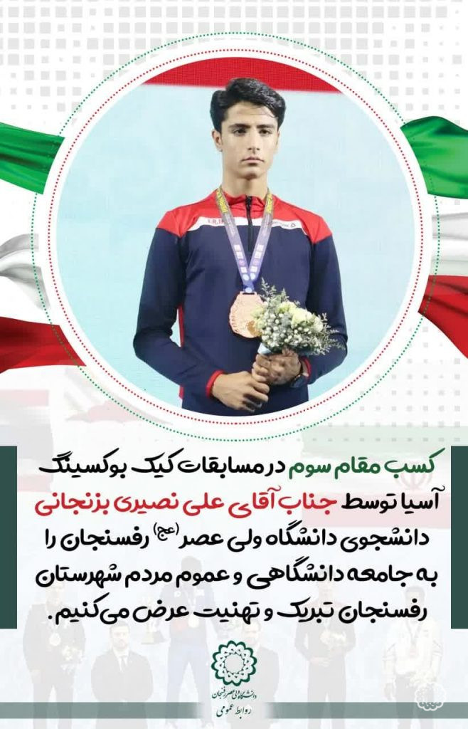 جناب آقای علی نصیری بزنجانی دانشجوی رشته فیزیک مهندسی ورودی ۱۴۰۰ در مسابقات آسیایی کیک بوکسینگ موفق به کسب مقام سوم گردید.