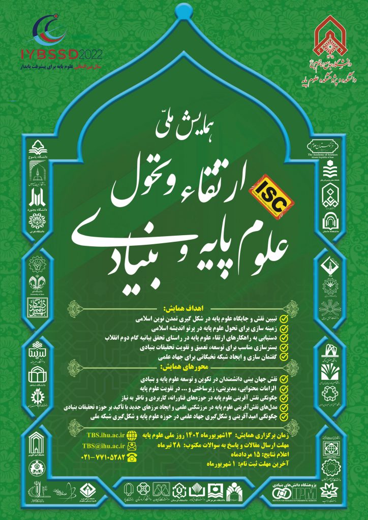 با سپاس و تشکر از اساتید ارجمندی که تا کنون برای همایش مقاله ارسال نموده و یا فایل سوالات مد نظر برای احصای دیدگاه ها و نظرات ارزشمند صاحبنظران را تکمیل نموده اند و همچنین قدردانی از همکاری دانشگاه هایی که با توجه به نامگذاری سال ۲۰۲۲ به عنوان سال جهانی علوم پایه، نسبت به برگزاری برنامه های مختلف تاثیر گذار در حوزه علوم پایه و بنیادی اقدام نموده اند، به اطلاع می رساند با توجه به مصوبه جلسه روز سهشنبه ۲۶ مهرماه ۱۴۰۱ شورای عالی انقلاب فرهنگی مبنی بر نامگذاری سیزده شهریور روز بزرگداشت ابوریحان بیرونی دانشمند و طبیعیدان ایرانی بهعنوان روز علوم پایه در تقویم کشور، شورای سیاست گذاری همایش، تصمیم گرفت که اولین همایش ملی ” ارتقاء و تحول علوم پایه و بنیادی” در تاریخ ۱۳ شهریور ۱۴۰۲ برگزار گردد و با توجه به اهمیت علوم پایه و بنیادی، در سال های بعد نیز در روز ۱۳ شهریورماه به عنوان روز علوم پایه کشور، این همایش با موضوعات جدید راهکارهای ارتقاء و تحول علوم پایه و بنیادی در کشور را پیگیری نماید.