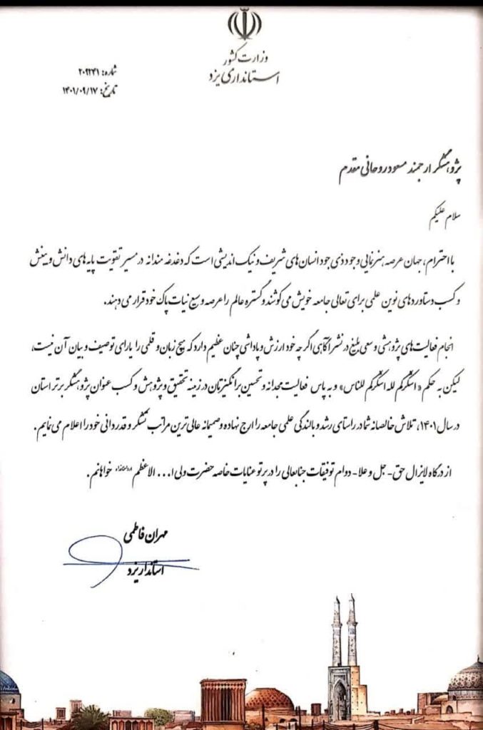 2023-01-16 | دیدگاهها برای دکتر مسعود روحانی مقدم به عنوان پژوهشگر برتر استان یزد در سال ۱۴۰۱ شناخته شدند بسته هستند | دکتر روحانی مقدم